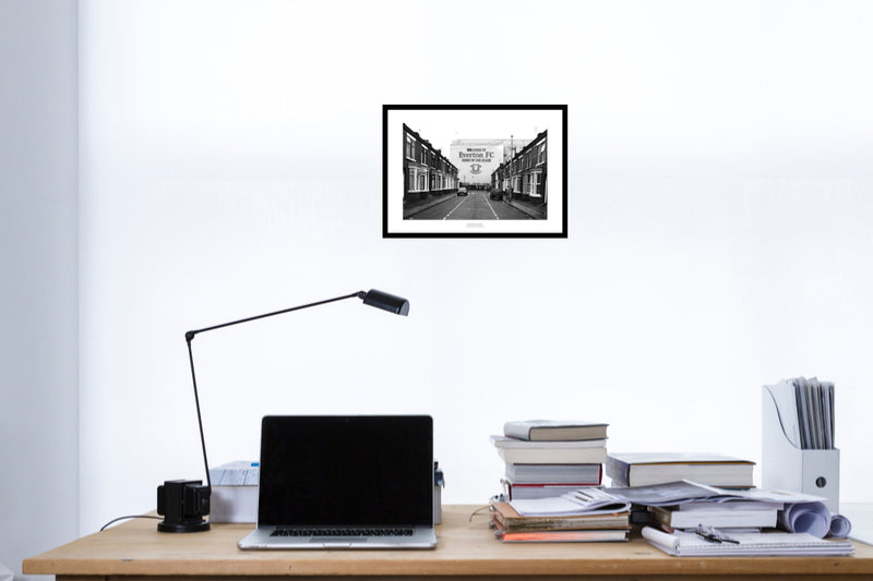 A superb photo showing the proximity of Everton's Goodison Park stadium to the housing around it. This magnificent Everton FC photo also features a short description of the event within the white border, although please note that the canvas prints are borderless and therefore do not include this description. The images are printed onto high quality photo paper .