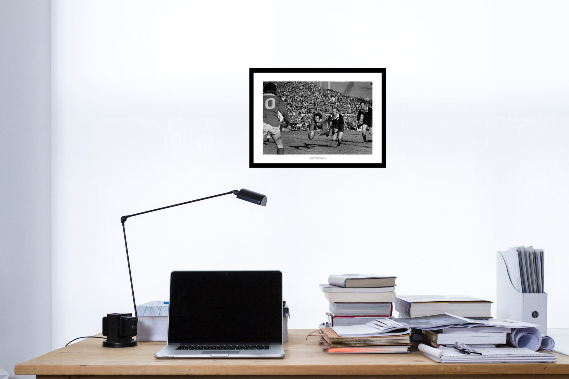 A historic photo of Wales rugby legend Gareth Edwards playing during the 1971 British Lions tour of New Zealand. This photo also features a short description of the event within the white border, although please note that the canvas prints are borderless and therefore do not include this description. The images are printed onto high quality photo paper.